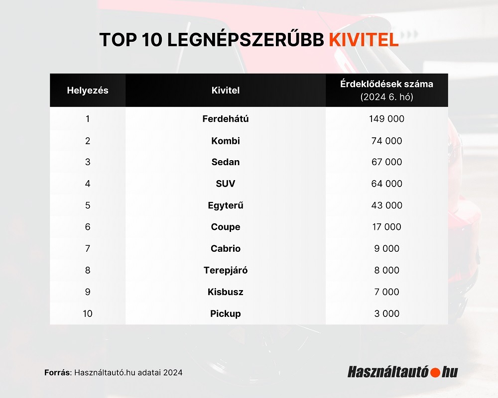 A Használtautó.hu portálon a legfrissebb adatlekérés alapján a felhasználók leginkább ferdehátú modelleket (149 ezer), kombikat (74 ezer), szedánokat (67 ezer), SUV-okat (64 ezer) és egyterűeket (43 ezer) keresnek.