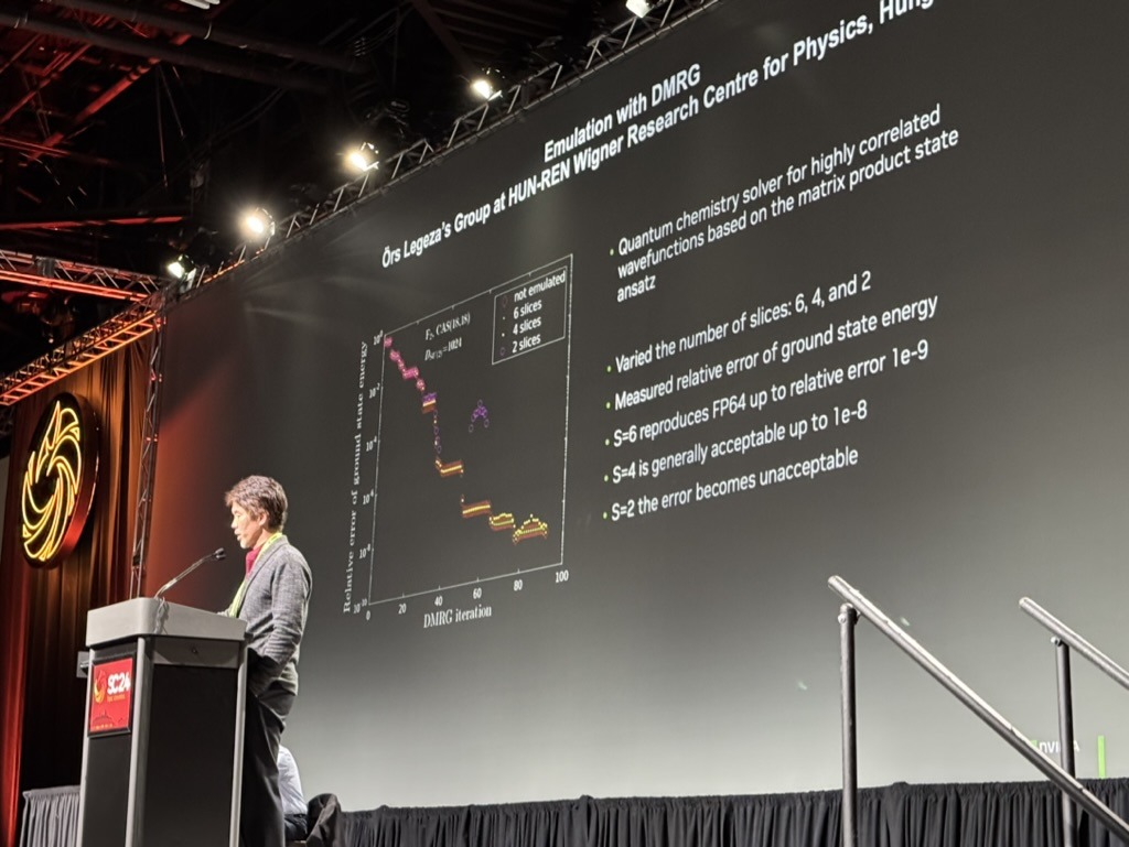 A világ legrangosabb szuperszámítógépes rendezvényén, az atlantai TOP500 Birds of a Feather (BoF) konferencián, az NVIDIA techcég a magyar kvantumszimulációs szoftver eredményeit felhasználva mutatta be legújabb gyorsító kártyáit és annak numerikus tulajdonságait. Legeza Örs, a HUN-REN Wigner Fizikai Kutatóközpont tudományos tanácsadója és Menczer Andor, az ELTE doktorandusz hallgatója az NVIDIA-val szoros együttműködésben a kvantumos rendszerek szimulációjára fejlesztett programcsomagjukat sikeresen integrálták a techcég legújabb, Blackwell technológiájára épülő B100 és B200 hardverek szoftveres megoldásaival.